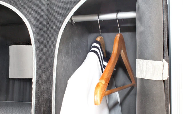 Großer Camping-Multifunktionsschrank mit 2 getrennten RV-Fächern und 6 innenliegenden Ablagen. Das schmälere Fach kann zudem dank mittig teilbarer Ablagen und einer eingebauten Hängestange zum Kleiderschrank umgebaut werden. Sehr stabile Ausführung mit Alu-Kreuzgestell und verwindungssteifen Rechteckprofilen. Vorder- und Hinterwand können durch eine spezielle Spannvorrichtung zusätzlich stabilisiert werden. Breite, schwenkbare Fußplatten verhindern das Einsinken des Schranks auf weichen Böden oder verhindern Beschädigungen am Zeltboden oder -teppich. Ein höhenverstellbarer Fuß erlaubt einen perfekten Niveauausgleich bei Bodenunebenheiten. Ein Gazefenster in der Rückwand sorgt für die Innenbelüftung des Schrankes. Mit praktischer Transport- und Aufbewahrtungstasche.
