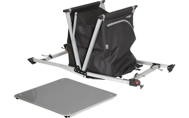 Neu entwickelter Mehrzweckschrank mit CROSS-Rahmen aus Aluminiumrohr. 1 Fuß des Schrankes ist höhenverstellbar, schwenkbar und groß genug, um ein Absinken in weicheren Böden zu verhindern. Mit großem Staufach und einer Arbeitsplatte aus verstärktem MDF-Material.
