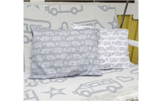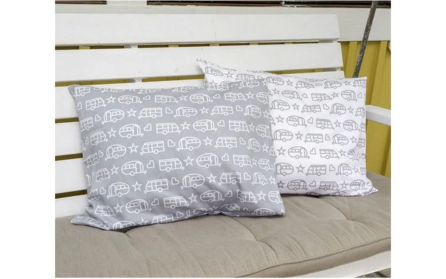 Pufz Kissenbezug weiß/grau mit zwei verschiedenen Mustern (Wohnwagen/Wohnmobil) einmal weiß auf grau und einmal grau auf weiß, beidseitig gedruckt.